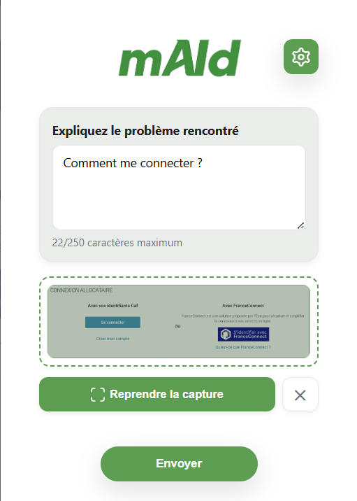 - mAId analyse la page (DOM). Vous pouvez joindre une capture (message d’erreur, bouton introuvable, etc.).