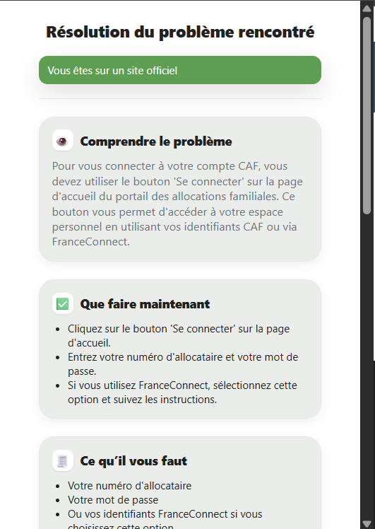 - Poser une question contextuelle directement sur un site officiel (CAF, Ameli…) et suivre les cartes de réponse.
