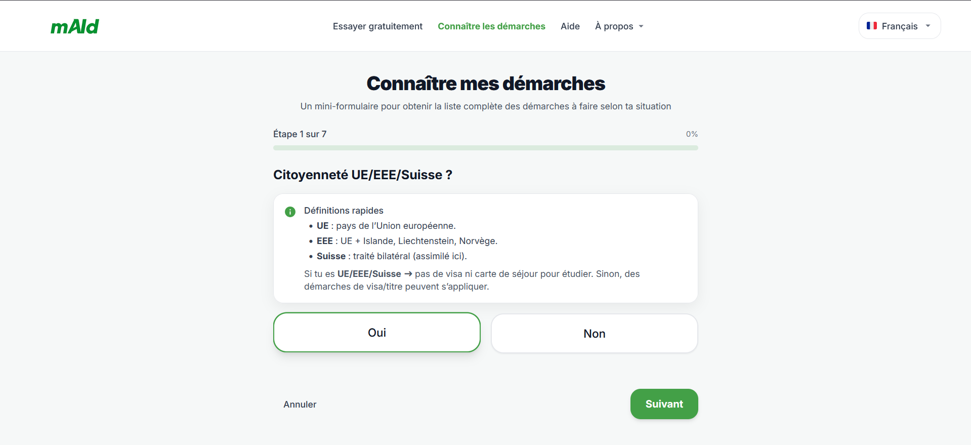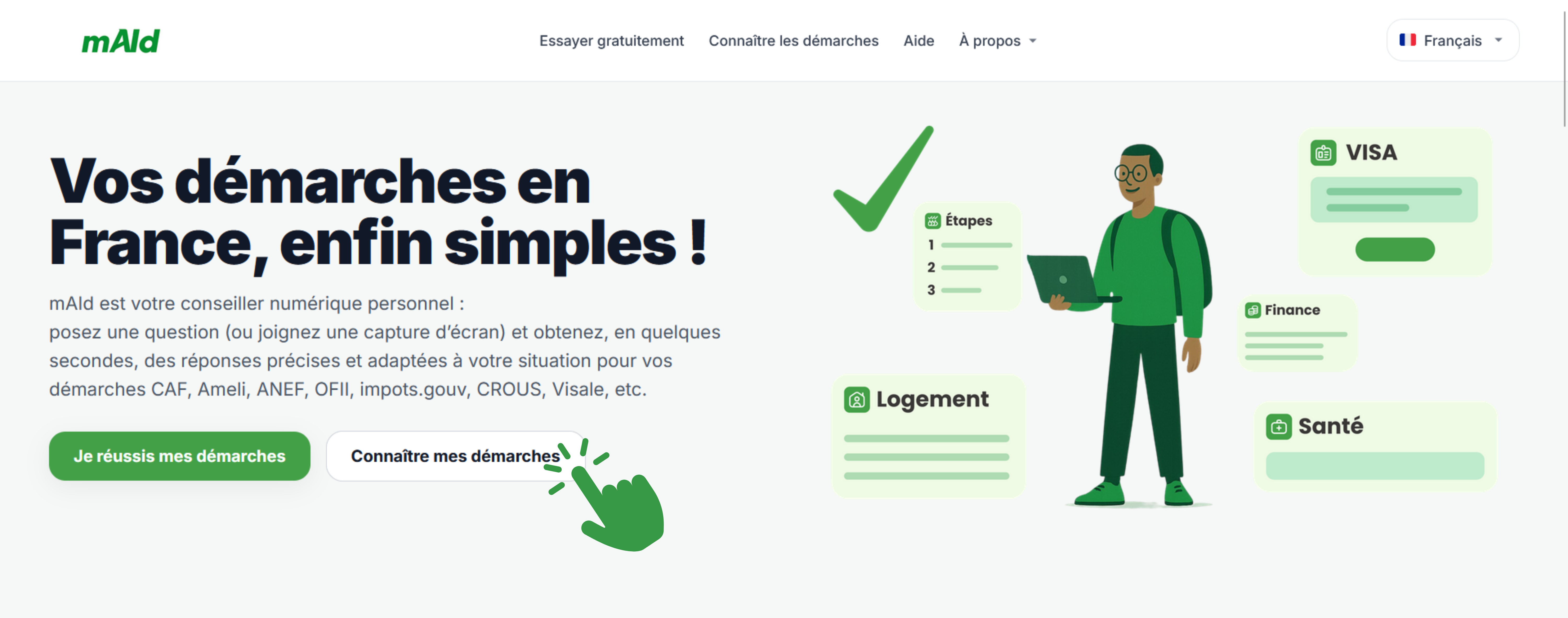 - Rendez-vous sur le site de mAId et lancez le questionnaire rapide accessible via le bouton "connaitre mes demarches"